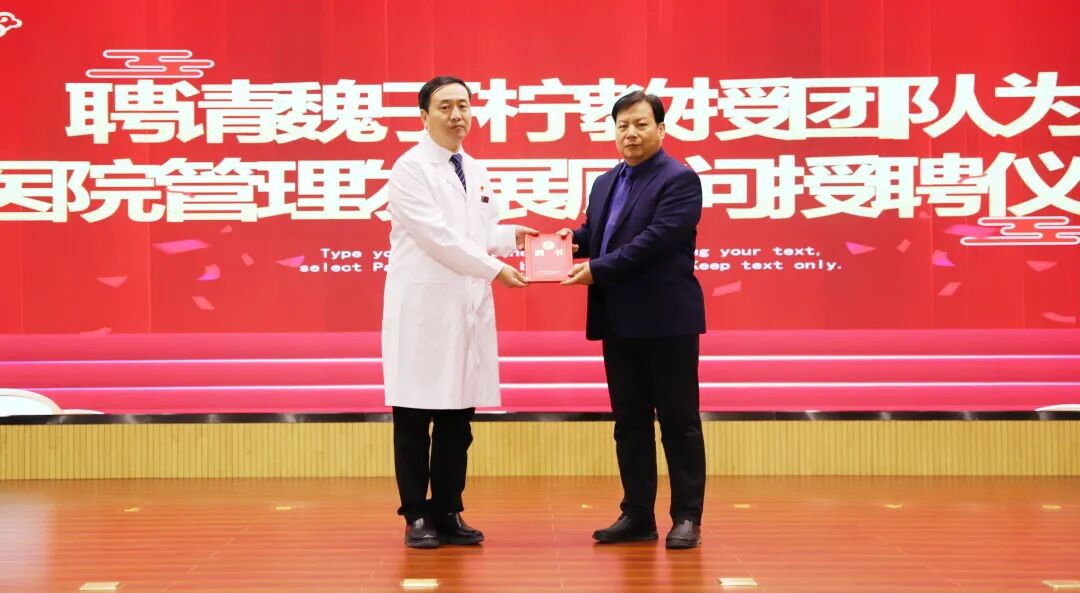临西县人民医院聘请医院管理发展顾问受聘仪式,我院党委书记孙健向魏子柠教授团队颁发聘书